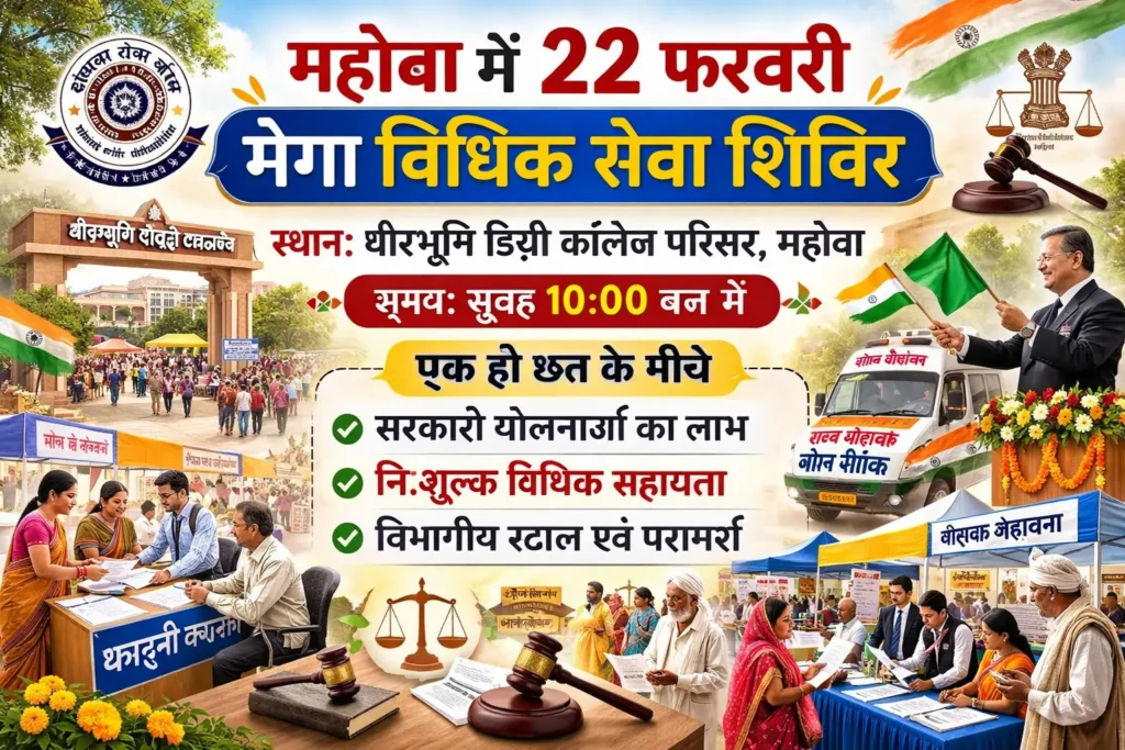 महोबा। जनपद महोबा में 22 फरवरी को विशाल मेगा विधिक सहायता एवं सेवा शिविर का आयोजन किया जाएगा। यह शिविर Veerbhumi Degree College परिसर में आयोजित होगा, जहां एक ही छत के नीचे विभिन्न विभागों की सरकारी योजनाओं और निःशुल्क कानूनी सहायता का लाभ नागरिकों को उपलब्ध कराया जाएगा।
