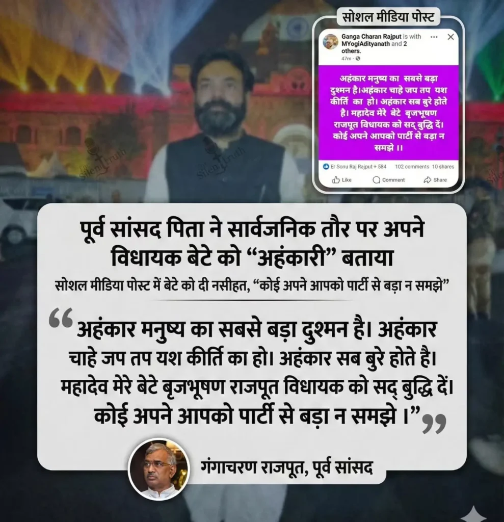 राजनीतिक हलकों में उस समय हलचल तेज हो गई जब पूर्व सांसद गंगाचरण राजपूत का एक सोशल मीडिया पोस्ट तेजी से वायरल होने लगा। इस पोस्ट में उन्होंने “अहंकार” को इंसान का सबसे बड़ा दुश्मन बताते हुए अपने ही विधायक बेटे बृजभूषण राजपूत को सार्वजनिक मंच से नसीहत दी—“कोई भी व्यक्ति अपने आपको पार्टी से बड़ा न समझे।”