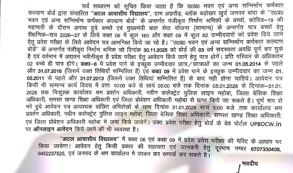 उ.प्र. भवन एवं अन्य सन्निर्माण कर्मकार कल्याण बोर्ड के अंतर्गत पंजीकृत निर्माण श्रमिकों के बच्चों एवं कोरोना काल में निराश्रित मुख्यमंत्री बाल सेवायोजन (सामान्य) के पात्र बच्चों को गुणवत्तापूर्ण शिक्षा के माध्यम से समाज की मुख्यधारा से जोड़ने के उद्देश्य से श्रम विभाग द्वारा संचालित अटल आवासीय विद्यालय में शैक्षणिक सत्र 2026–27 हेतु प्रवेश प्रक्रिया प्रारंभ कर दी गई है।