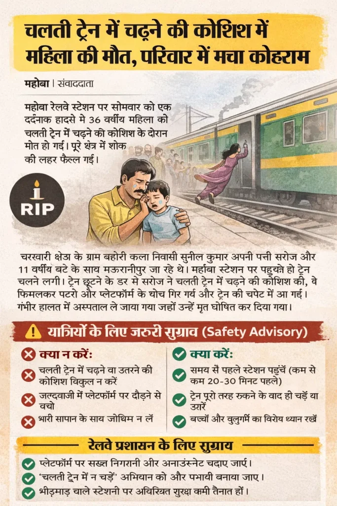 महोबा रेलवे स्टेशन पर सोमवार को एक दर्दनाक हादसे में 36 वर्षीय महिला की चलती ट्रेन में चढ़ने के प्रयास के दौरान मौत हो गई। घटना के बाद मृतका के परिवार में कोहराम मच गया और पूरे क्षेत्र में शोक की लहर फैल गई।